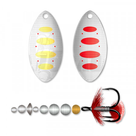 Данная модель вертушки выпускается в 7 размерных вариантах. Самая маленькая блесенка имеет лепесток №00 длиной 22,2 мм, а ее общий вес составляет всего 2,8 грамма. А самая крупная вертушка в модельном ряде имеет лепесток №5 длиной ровно 70 мм, при весе в 38,4 грамма. Такое размерное разнообразие позволяет с помощью данной вращающееся приманки ловить как некрупных красноперку, чехонь и уклейку, так и увесистых щуку, сома, тайменя, ленка и других крупных рыб.