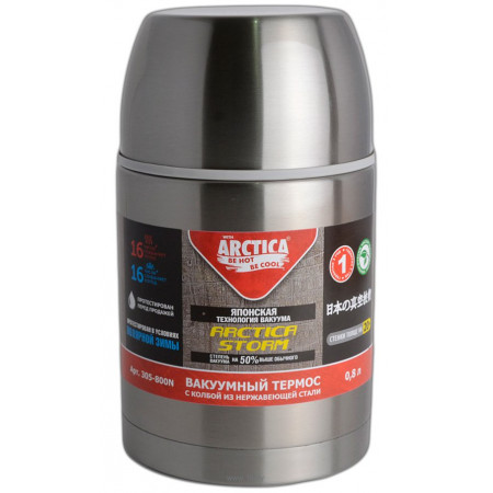 Термос Арктика 305-800N серебристый – это симфония новейших технологий и традиционного качества. Выполненный из нержавеющей стали термос способен поддерживать заданную температуру до 16 часов. Лучшей теплоизоляции послужит также и двойная пробка с термоизолятором, предотвращающая попадание в термос более холодного воздуха. Заядлые путешественники по достоинству оценят эффективность термоса во время поездок или походов. Вкусная домашняя еда или горячий чай по максимуму сохранят свои вкус и аромат благодаря Арктика 305-800N, а для более удобного использования в термосе очень широкое горлышко, чтобы можно было положить туда все, чем вы захотите полакомиться. Крышка термоса одновременно представляет собой стакан для напитка. Серебристый корпус термоса выглядит очень элегантно и сдержанно, а тонкое покрытие лаком позволяет поддерживать термос чистым в том числе и снаружи, при этом абсолютно не вредит здоровью.