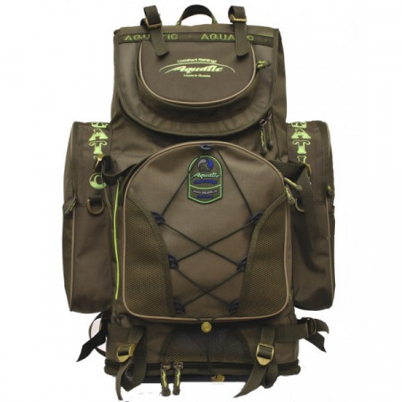 Рюкзак Aquatic объемом около 85 литров изготавливается из непромокаемых нейлоновых материалов повышенной прочности. Рюкзак имеет 2 изолированных отделения, нижнее отделение вентилируемое (его можно использовать для обуви или мокрых вещей). Данная модель имеет 6 дополнительных карманов и множество лямок для закрепления дополнительного оборудования снаружи. Спинка имеет пластиковую основу, плюс дополнительное уплотнение для комфортного ношения тяжелых и твердых предметов. Конструкция подвески рюкзака с грудной и поясной регулировкой позволяет регулировать подвеску по высоте человека. На поясе имеется дополнительный карман.